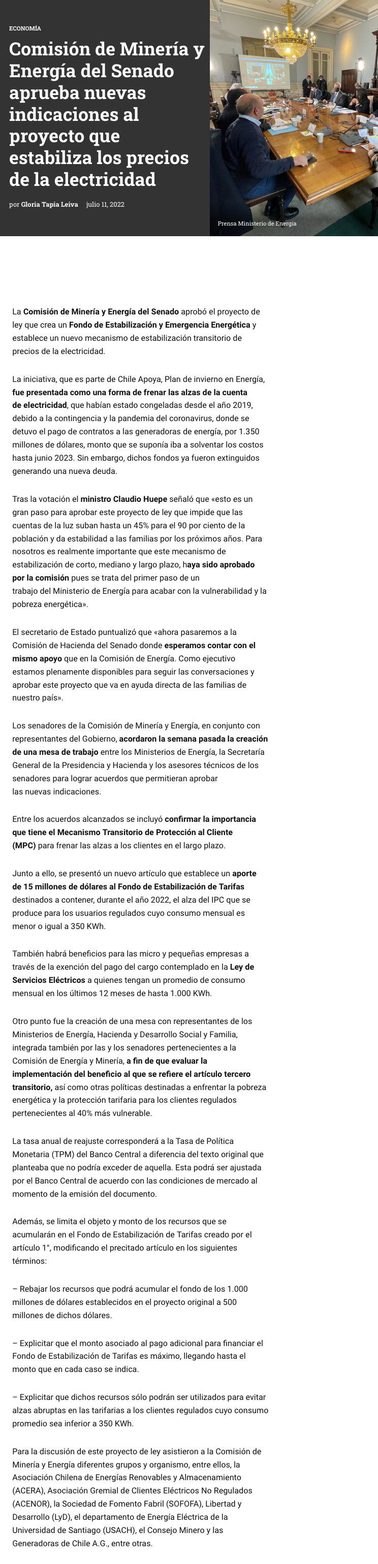 Comisión del Senado despacha proyecto que estabiliza precio de las cuentas de electricidad - (biobiochile online)