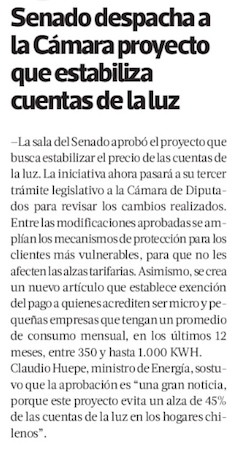 Sala del Senado aprueba proyecto para estabilizar cuentas de la luz - (Diario Financiero)