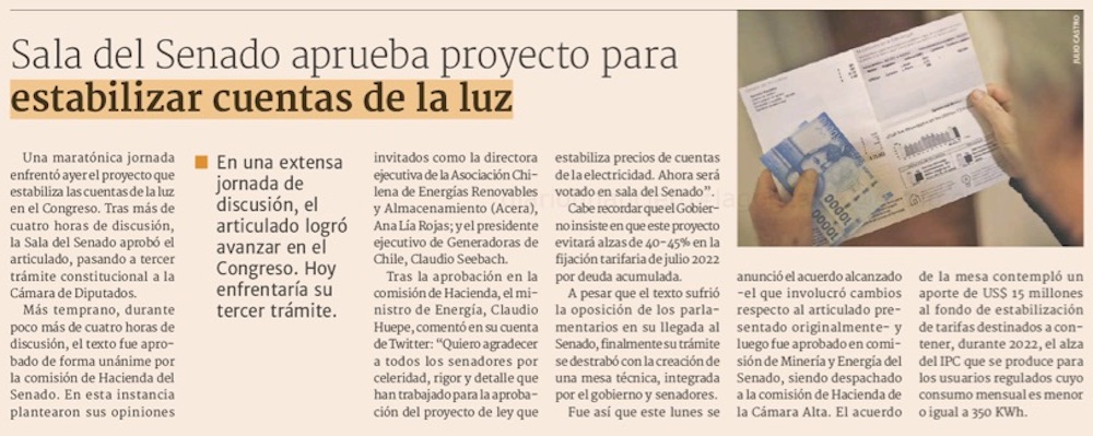 Senado despacha a la Cámara proyecto que estabiliza cuentas de la luz - (Pulso)