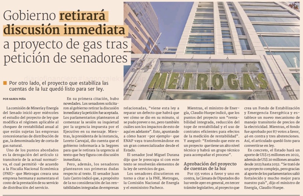Gobierno retirará urgencia a propuesta de ley corta del gas - (El Mercurio de Santiago)