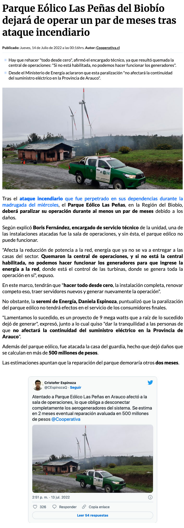 Atentado contra parque eólico en Arauco provoca cese de funciones por dos meses - (Diario Concepción)