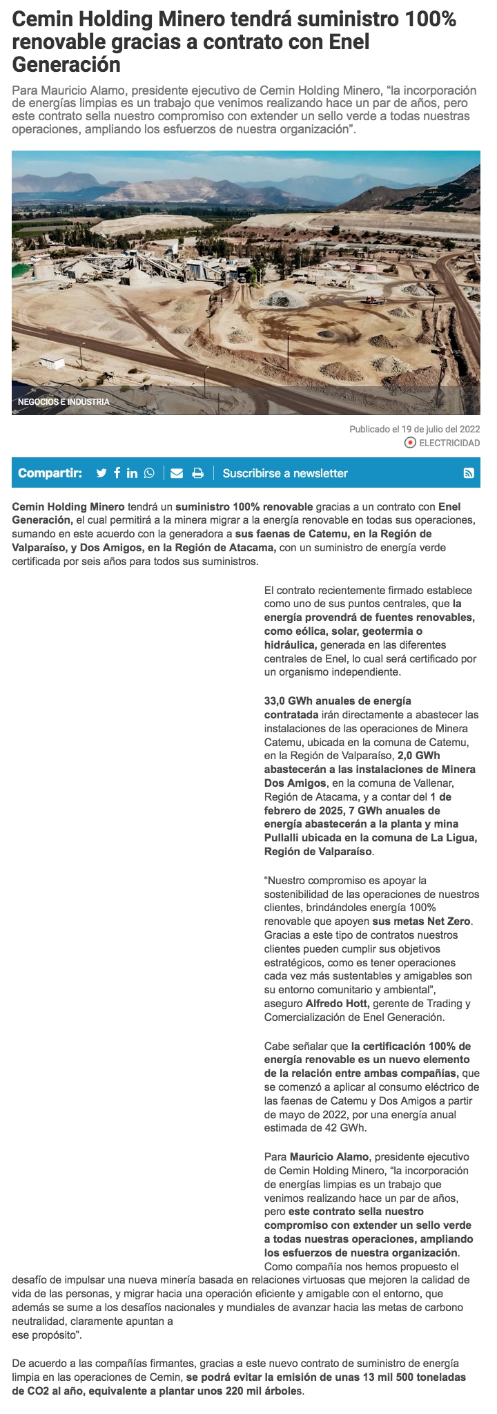 Contrato entre Enel Generación y CEMIN permitirá un suministro 100% renovable en todas las operaciones del holding minero - (eldinamo)
