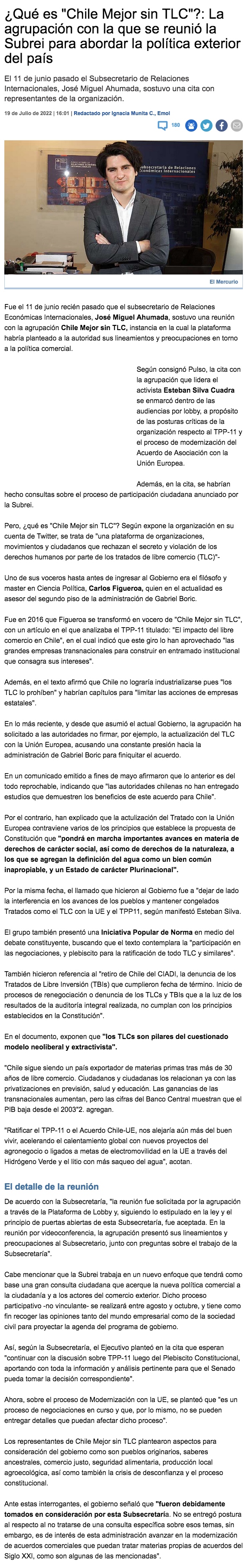 Subsecretario Ahumada se reunió con plataforma “Chile Mejor sin TLC” - (El Mercurio de Santiago)