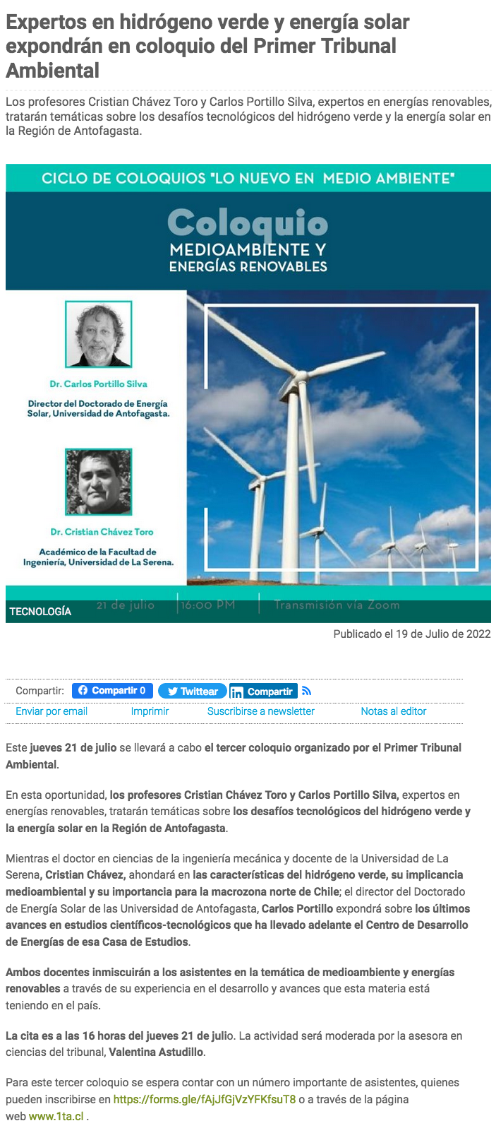 Expertos en hidrógeno verde y energía solar expondrán en coloquio del Primer Tribunal Ambiental - (revistaei.cl)