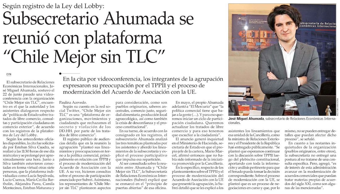 La reunión entre el subsecretario de Relaciones Económicas Internacionales con la agrupación "Chile Mejor sin TLC" - (Pulso)