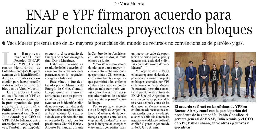 ENAP e YPF de Argentina firmaron acuerdo para analizar potenciales proyectos en Vaca Muerta - (elperiodista.cl)