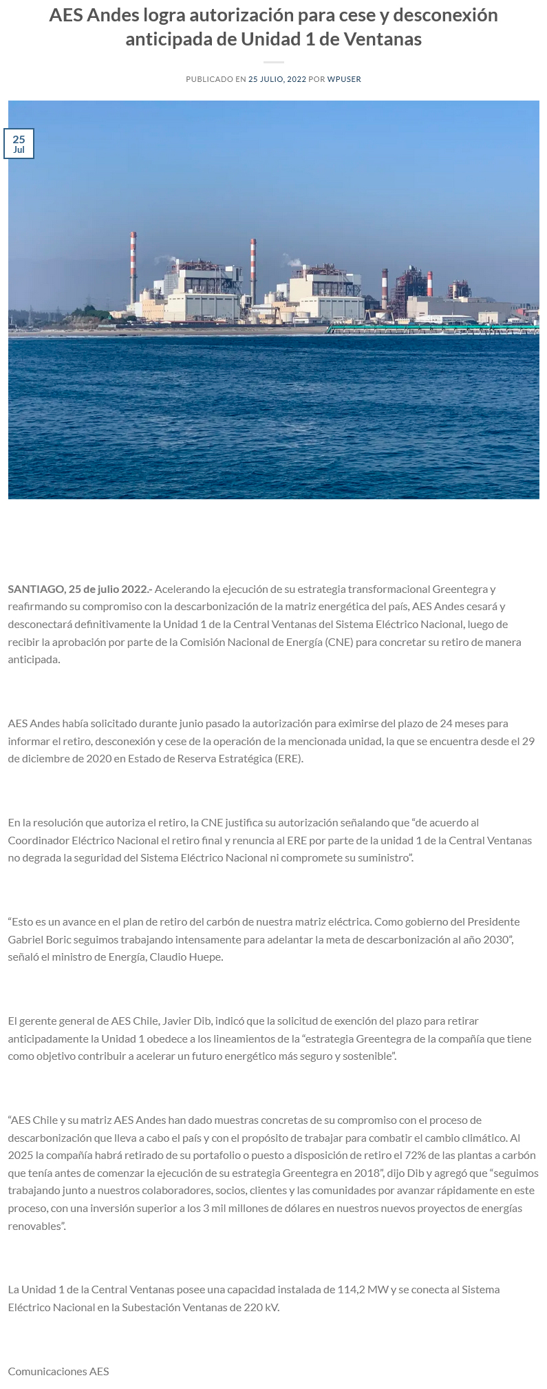 AES Andes logra autorización para cese y desconexión anticipada de Unidad 1 de la central a carbón Ventanas - (eldinamo)