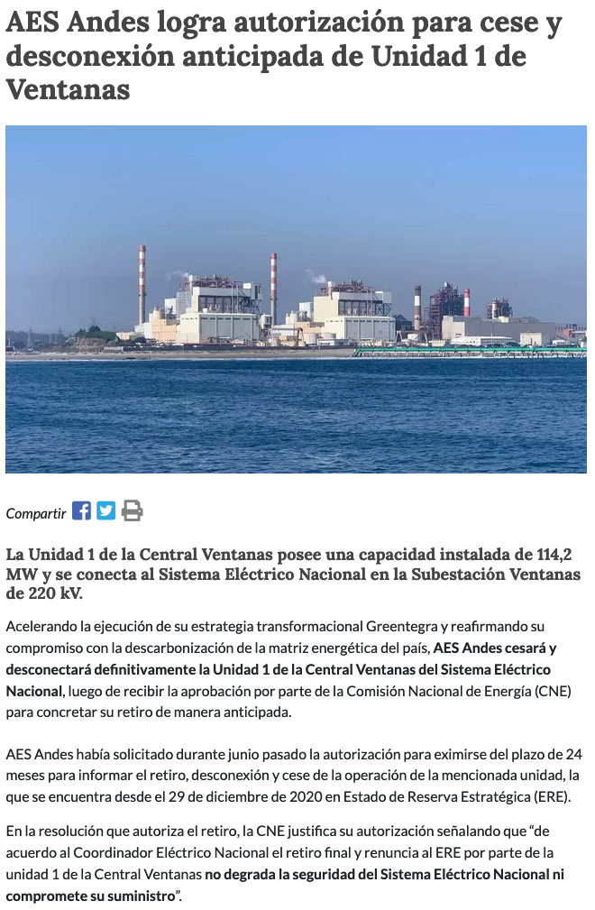 AES Andes cesará y desconectará definitivamente Ventanas I tras aprobación de la CNE - (redimin)