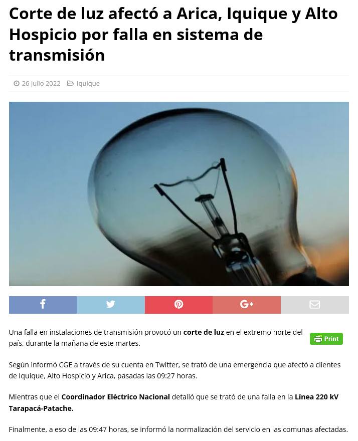 Falla en línea de transmisión provocó interrupción de suministro eléctrico en Arica, Iquique y Alto Hospicio - (elreporterodeiquique)