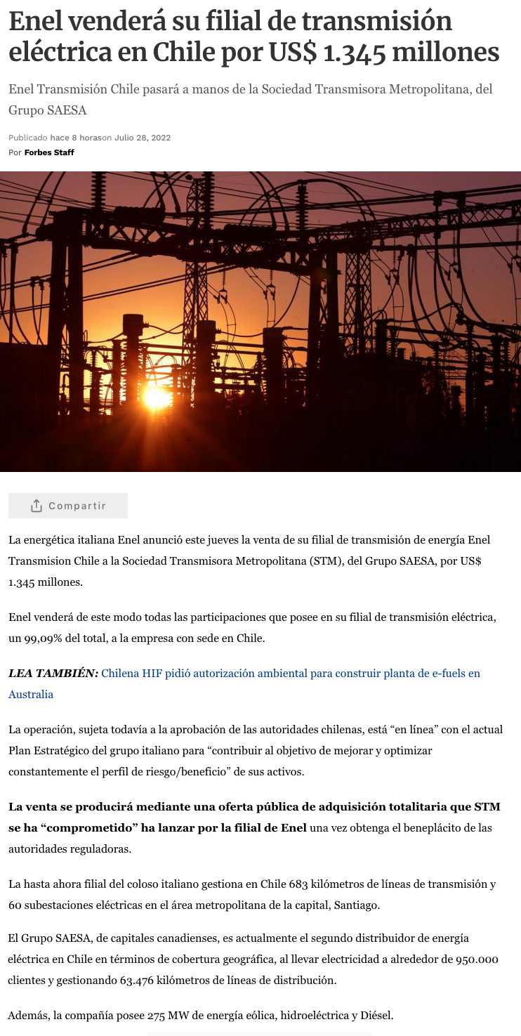 Enel acuerda venta de sus líneas de transmisión por US$ 1.500 millones - (El Mercurio de Santiago)