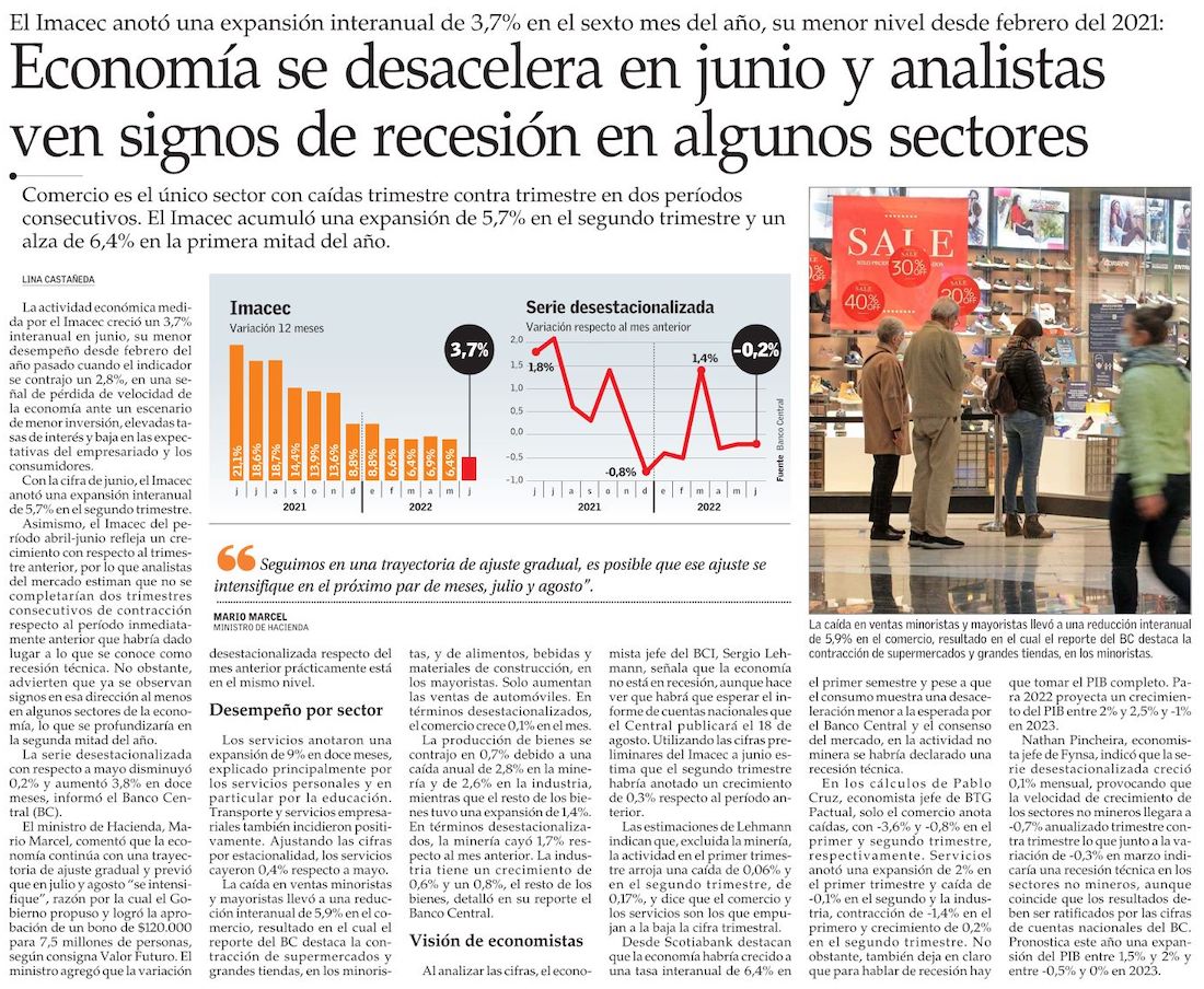 Tras crecer 3,7% en junio, economía se encamina a caídas desde agosto o septiembre - (Diario Financiero)