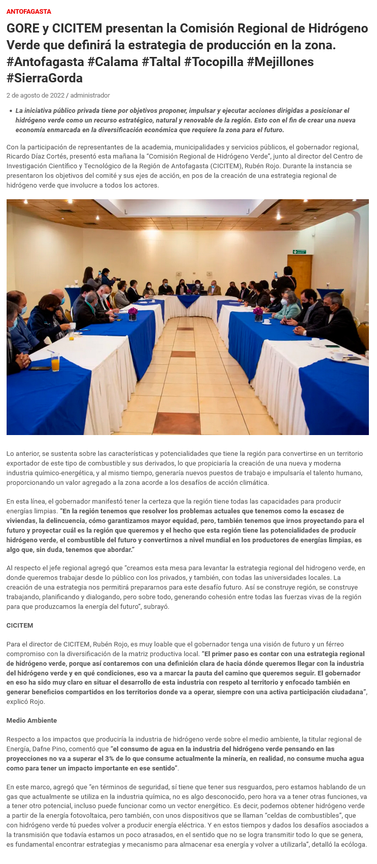 Presentan la Comisión Regional de Hidrógeno Verde que definirá la estrategia de producción en la zona - (El Mercurio de Calama)