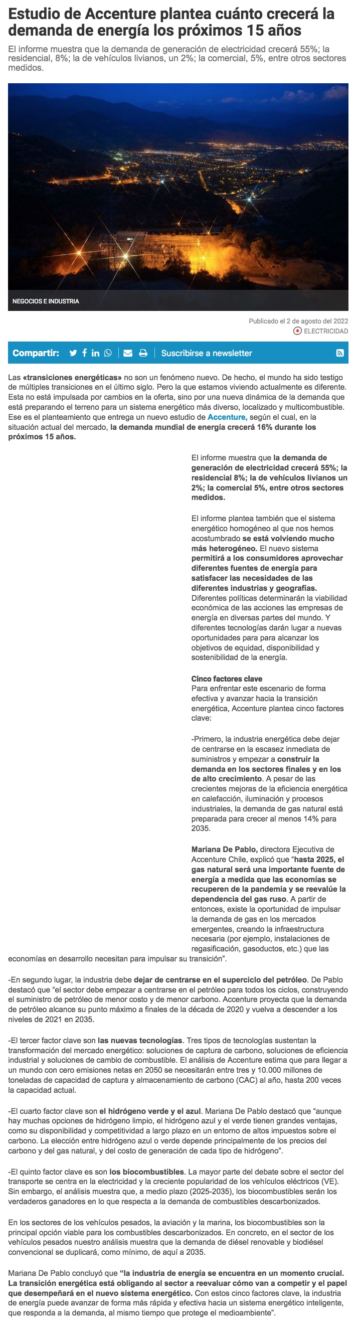 Accenture: Estudio plantea cuánto crecerá la demanda de energía los próximos 15 años - (mch.cl)