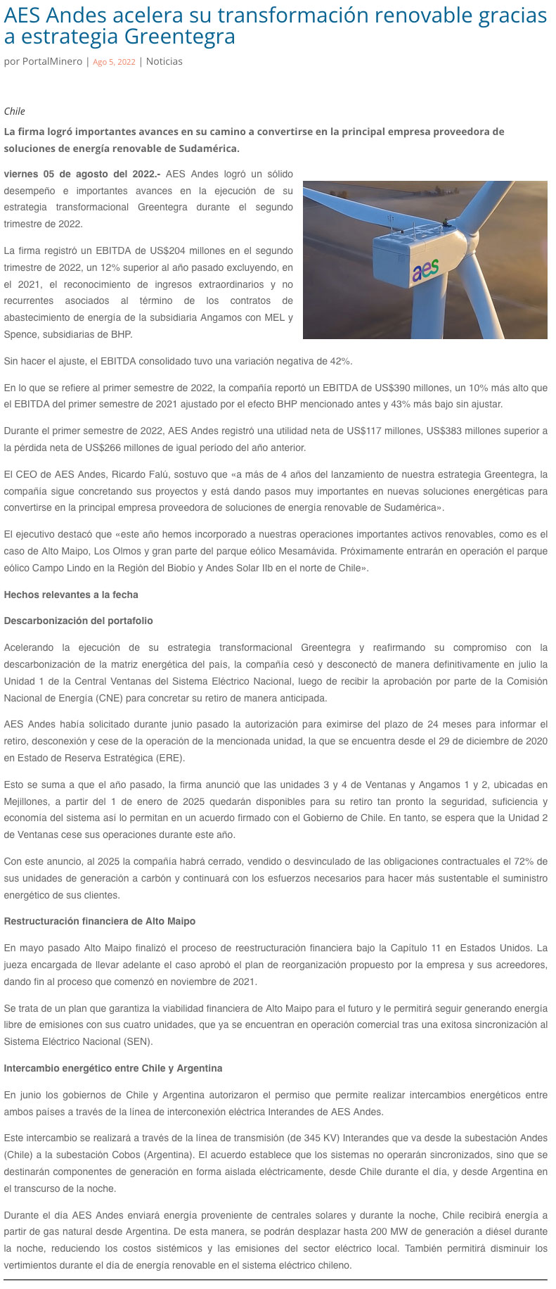 AES Andes acelerará su transformación renovable con retiro de termoeléctricas - (El Mercurio de Calama)