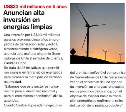 Generadoras anuncian inversiones por US$ 23 mil millones en cinco años - (El Mercurio de Santiago)