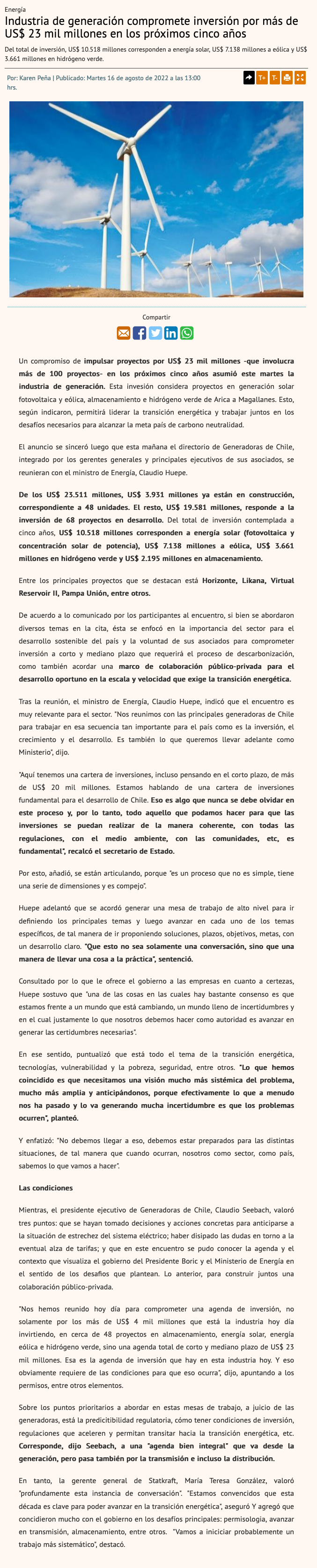 Industria de generación compromete inversiones ERNC por US$23 mil millones para apoyar transición energética - (revistaei.cl)