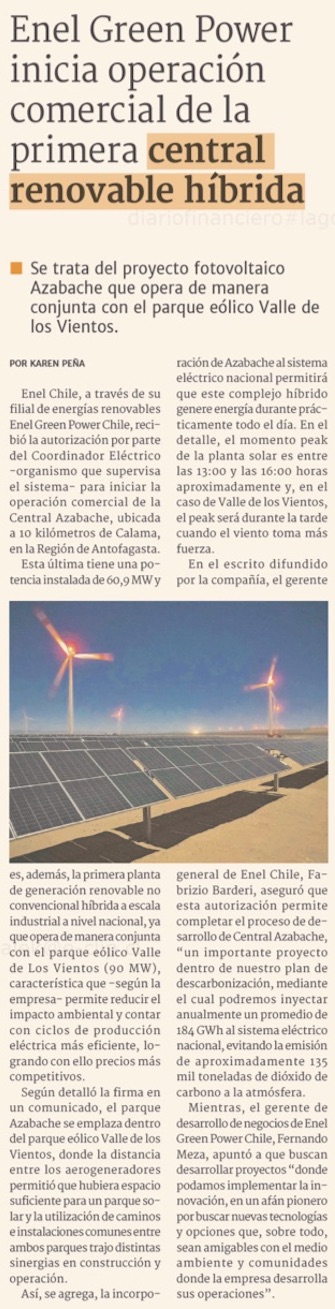 Enel inicia operación de la primera central renovable híbrida del país a escala industrial - (El Mercurio de Santiago)