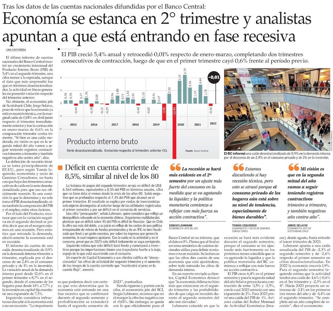 Economía chilena acentuó desaceleración en el segundo trimestre y mercado ya habla de una recesión técnica - (Diario Financiero)
