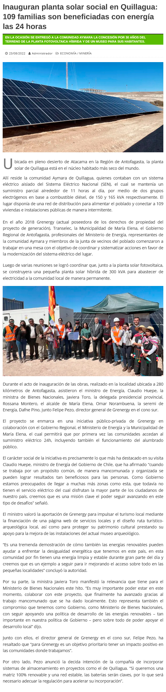 Ministro de Energía inaugura la planta solar social de Grenergy en Quillagua - (El Mercurio de Calama)
