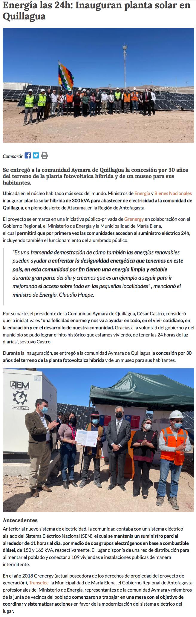 En María Elena inauguran planta solar que proveerá suministro permanente a comunidad aymara - (revistaei.cl)