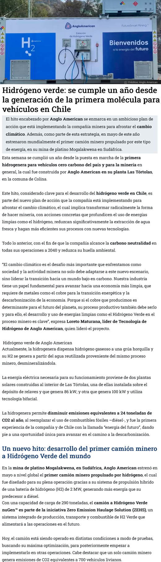 Hidrogenera de Anglo American cumple un año de operación - (mch.cl)