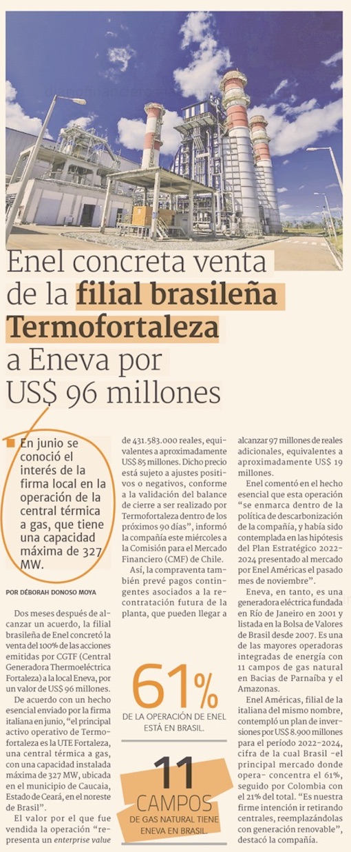 Filial de ENEL AMERICAS en Brasil finalizó enajenación de Termofortaleza - (Estrategia)