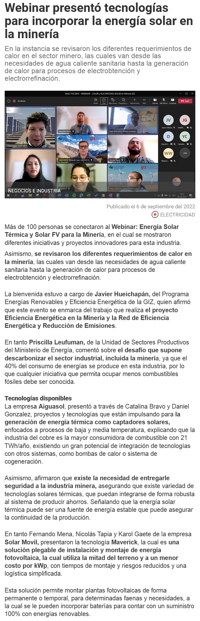 Webinar presentó tecnologías para incorporar la energía solar en la minería - (mch.cl)