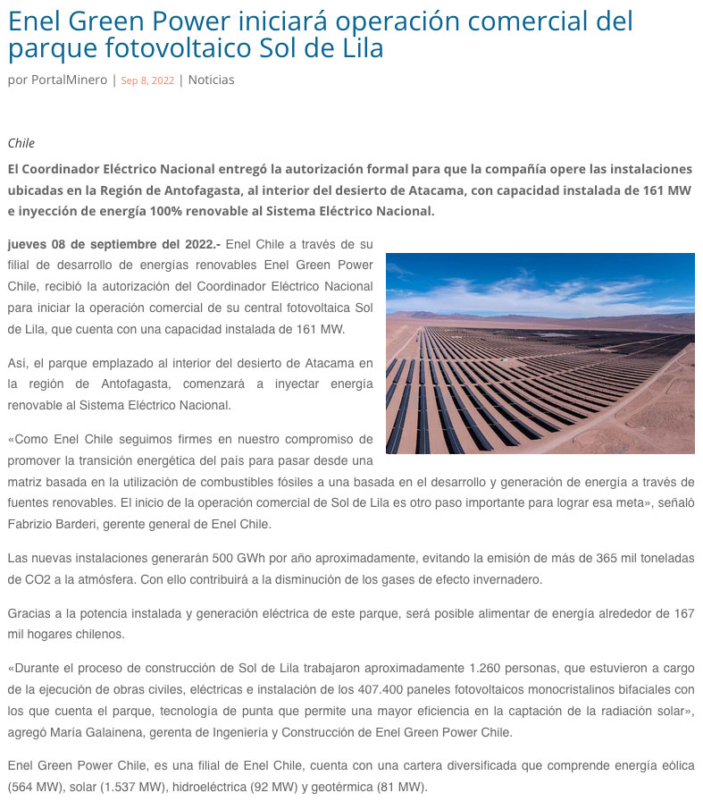 Enel Green Power recibe autorización para iniciar operación comercial del parque fotovoltaico Sol de Lila - (Nostálgica Online)