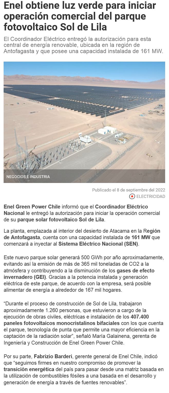 Enel Green Power recibe autorización para iniciar operación comercial del parque fotovoltaico Sol de Lila - (Nostálgica Online)