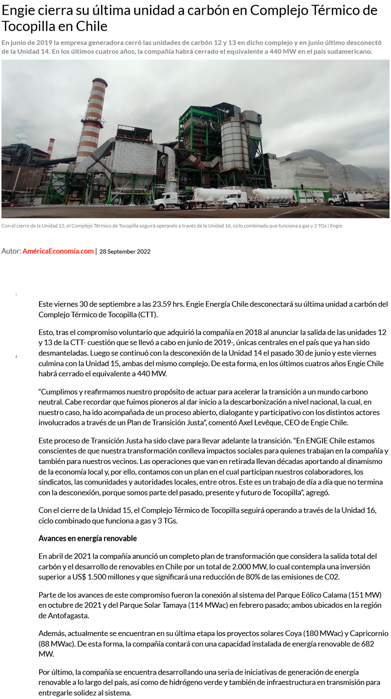 Engie cierra este viernes la última unidad a carbón del Complejo Térmico de Tocopilla - (El Mercurio de Antofagasta)