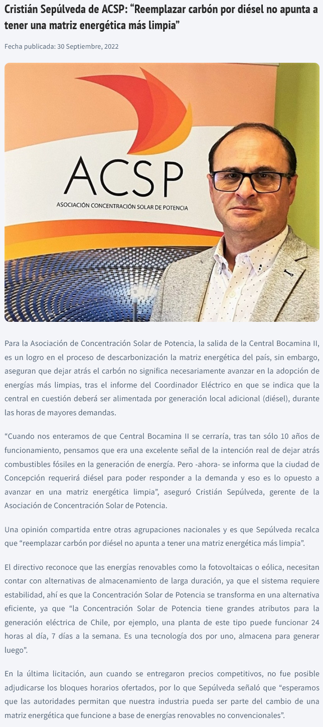 ACSP: “Reemplazar carbón por diésel no apunta a tener una matriz energética más limpia” - (revistaei.cl)