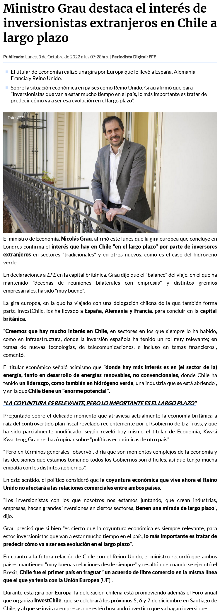 Grau destacó el interés de inversionistas extranjeros en Chile “en el largo plazo” - (laNacion)