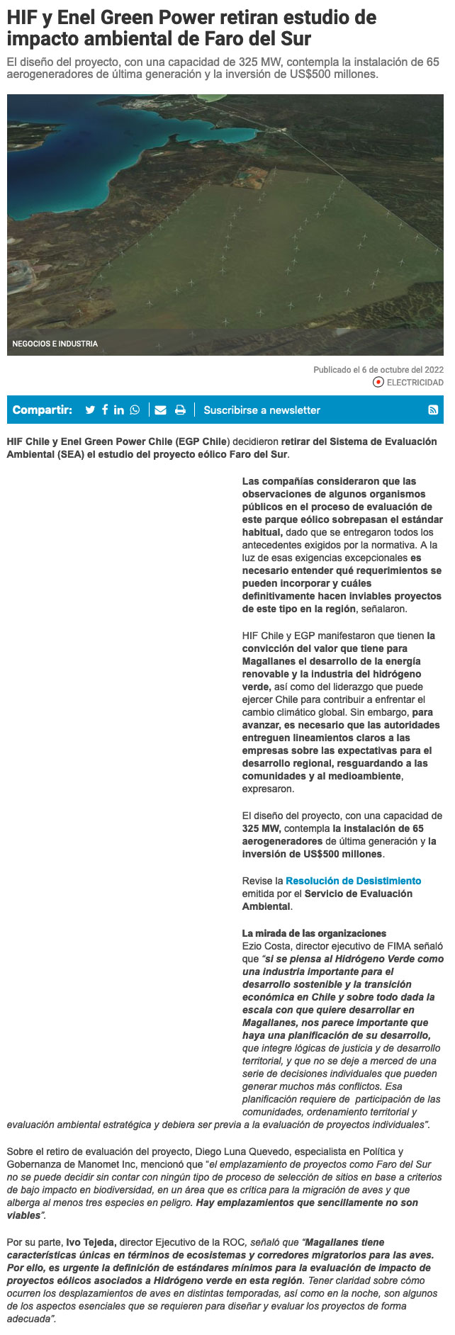 HIF y Enel Green Power retiran estudio de impacto ambiental de proyecto eólico en Punta Arenas - (cooperativa.cl)