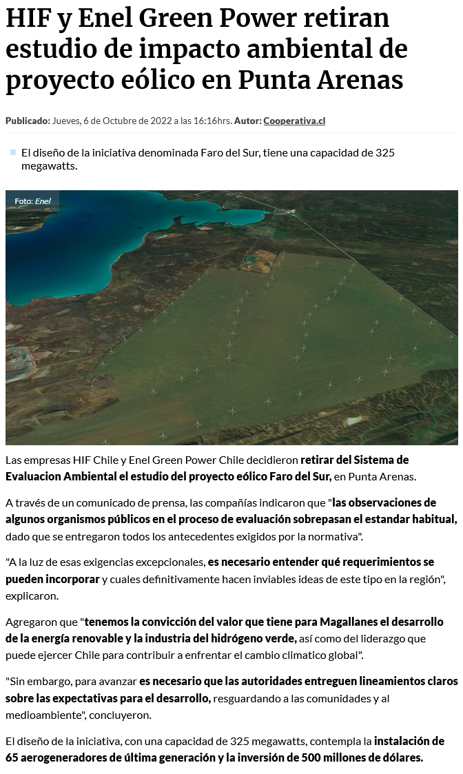 HIF y Enel Green Power retiran estudio de impacto ambiental del Faro del Sur - (h2news.cl)