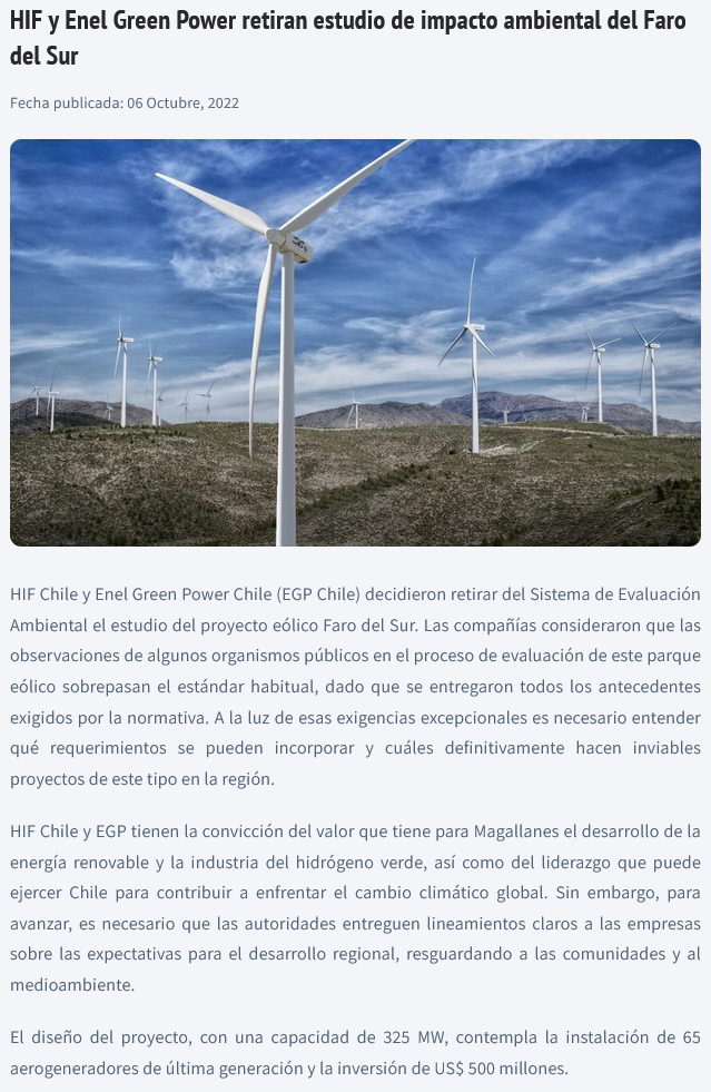 HIF y Enel Green Power retiran estudio de impacto ambiental de Faro del Sur - (revistaei.cl)