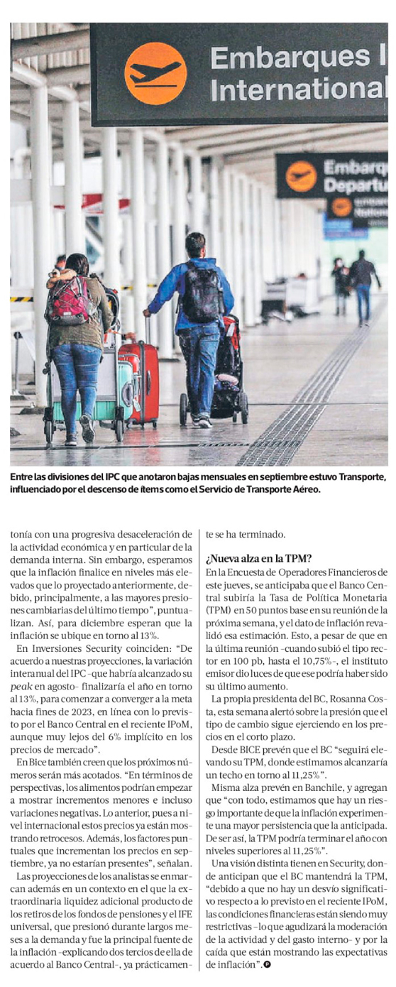 IPC sube 0,9% en septiembre, pero inflación anualizada cede y abre debate por alza de tasa - (El Mercurio de Santiago)