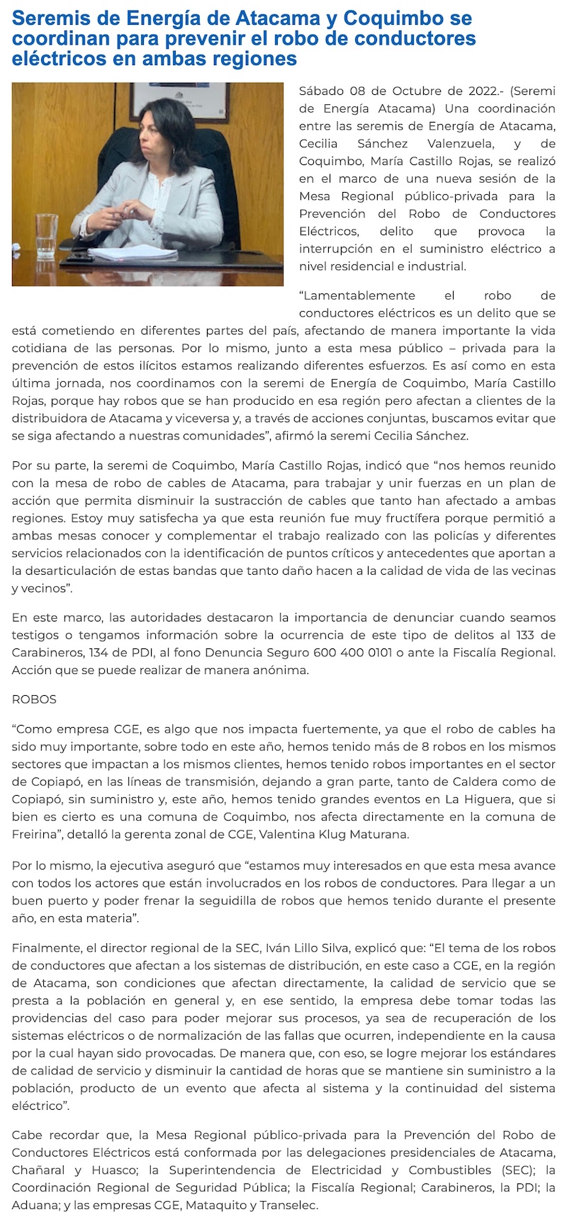 Seremis de Energía de Atacama y Coquimbo se coordinan para prevenir robo de conductores eléctricos en ambas regiones - (revistaei.cl)