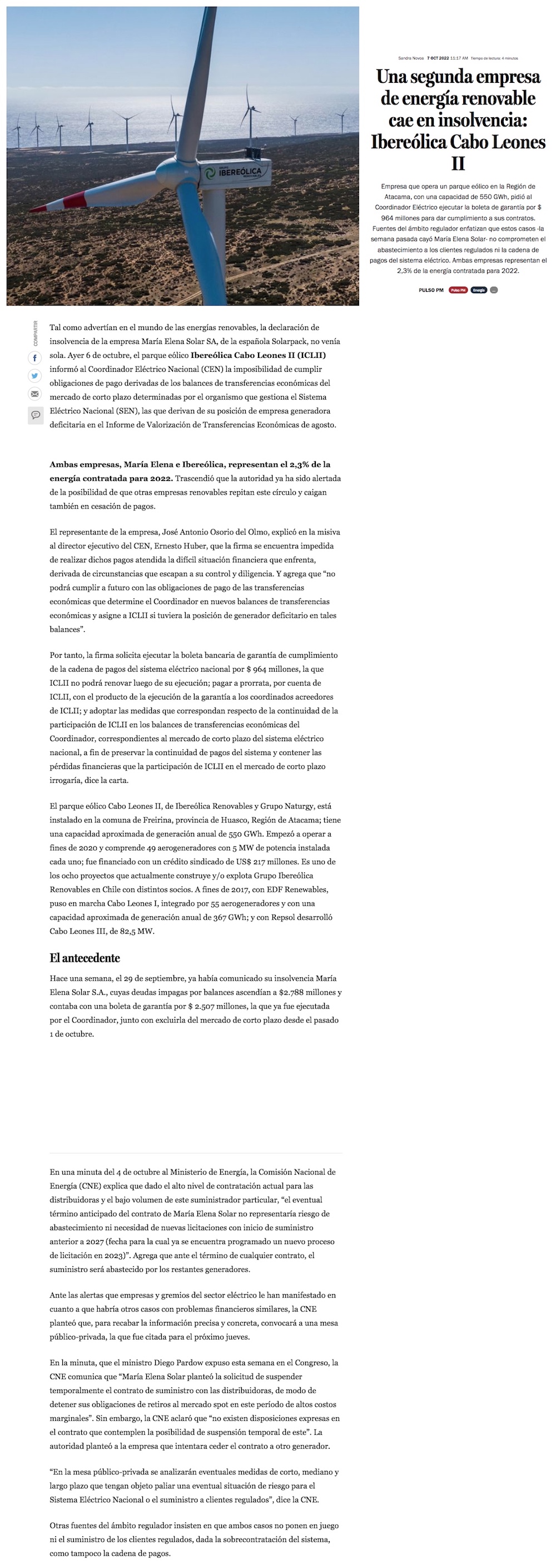 Eléctricas: Caída de segunda empresa renovable hace temer más insolvencias en sector eléctrico - (Pulso)
