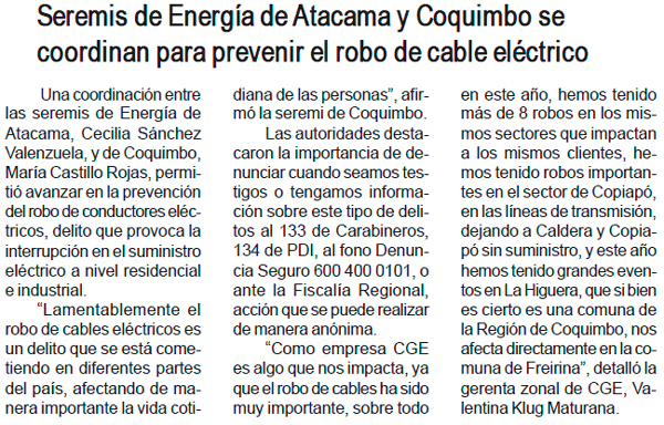 Seremis de Energía de Atacama y Coquimbo se coordinan para prevenir robo de conductores eléctricos en ambas regiones - (revistaei.cl)
