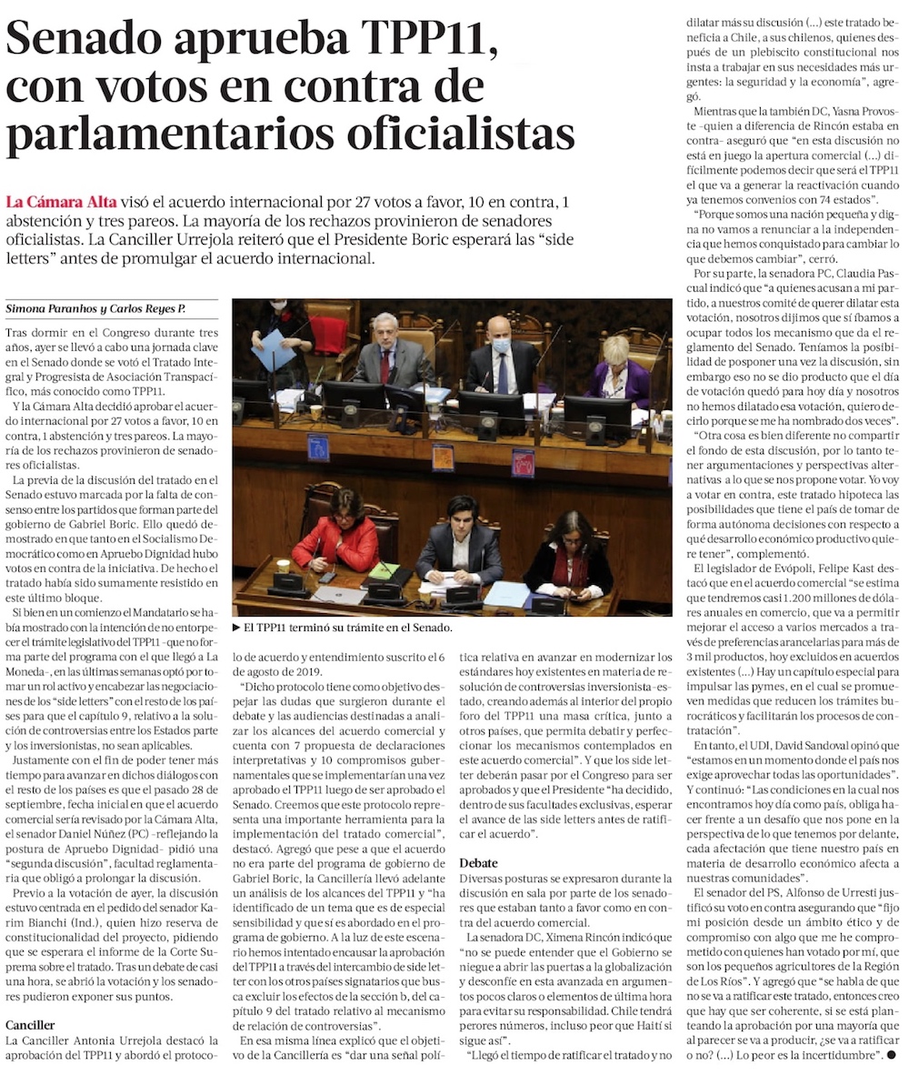 Sala del Senado da luz verde al TPP11 pese a críticas, pero el Gobierno seguirá con proceso de side letters - (Diario Financiero)