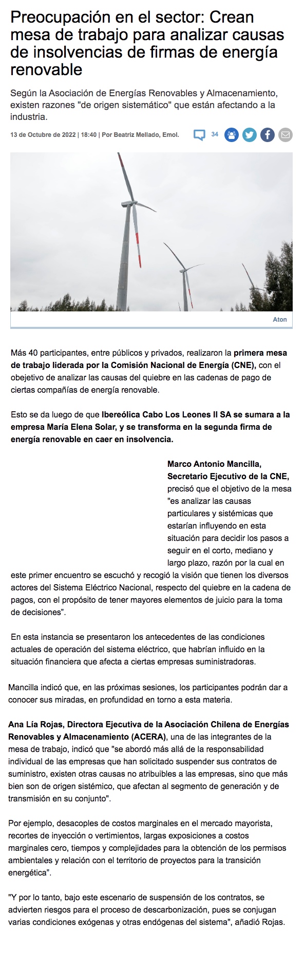 Se inicia mesa de trabajo por renovables en insolvencia - (El Mercurio de Santiago)