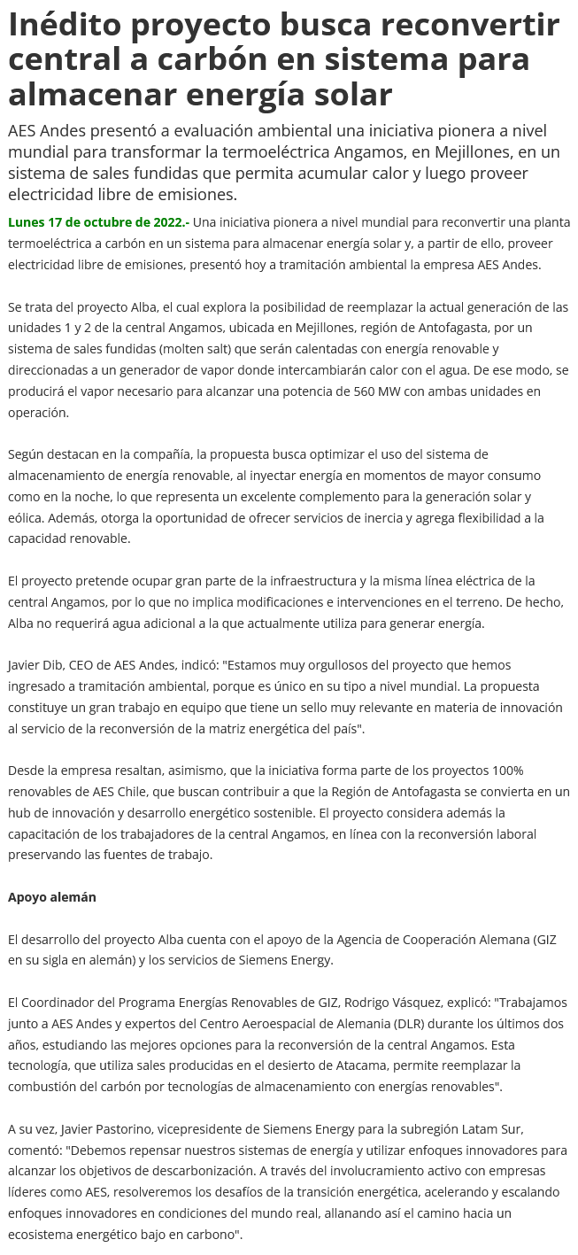 AES Andes ingresa a tramitación ambiental proyecto para reconvertir plantas a carbón con nueva tecnología solar - (Pulso)