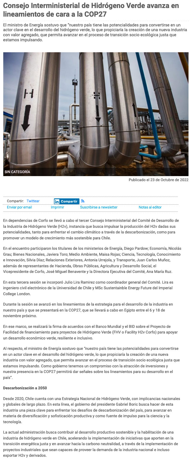 Consejo Interministerial de Hidrógeno Verde avanza en lineamientos de cara a la COP27 y fomento para el desarrollo de la industria en Chile - (norteyenegia.cl)