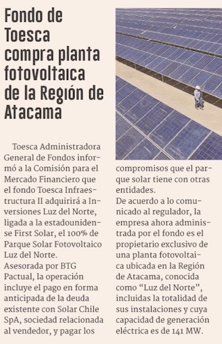 Fondo de Toesca comprará planta solar - (El Mercurio de Santiago)