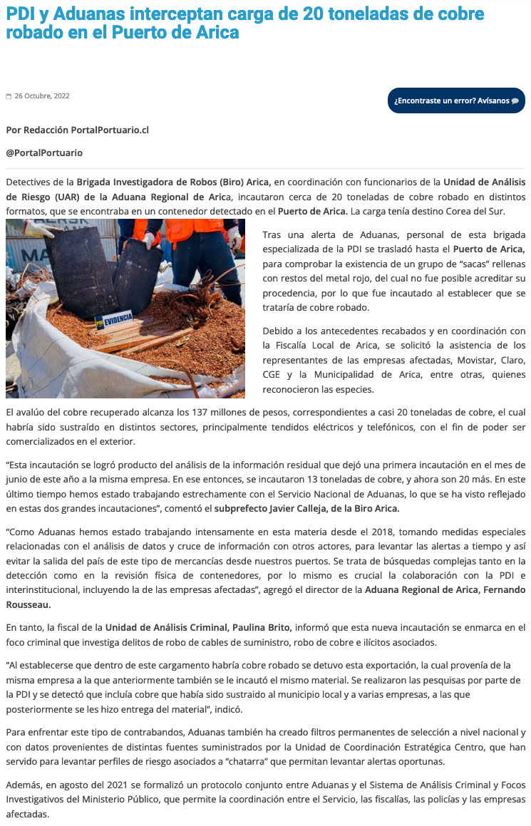 PDI y Aduanas incautaron cerca de 20 toneladas de cobre robado en puerto de Arica - (diarioelnortino)
