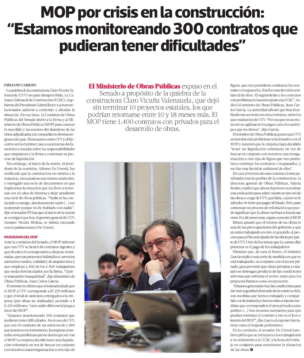 Ministerio de Obras Públicas reconoce deudas con Claro Vicuña Valenzuela por $7.200 millones - (El Mercurio de Santiago)