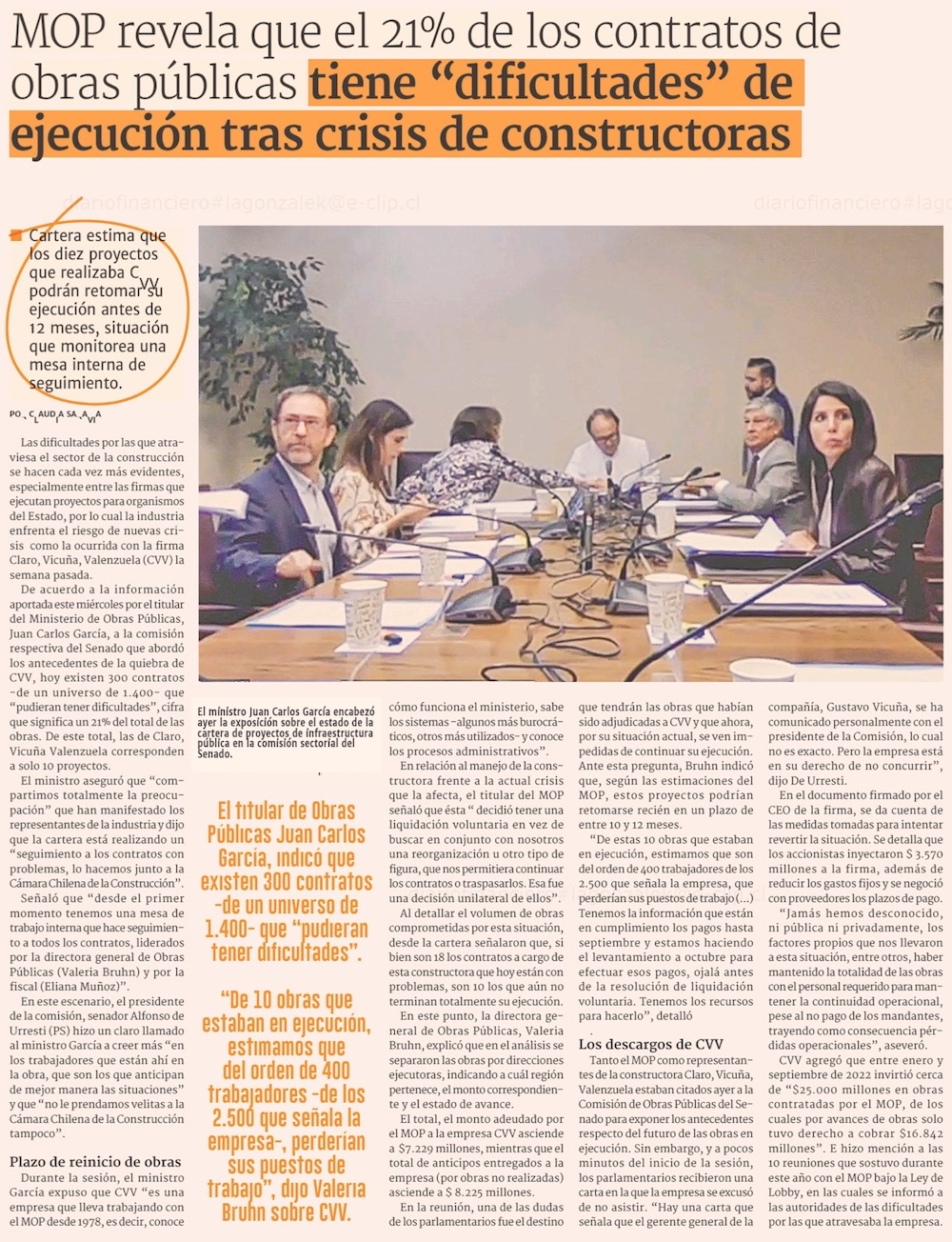Ministerio de Obras Públicas reconoce deudas con Claro Vicuña Valenzuela por $7.200 millones - (El Mercurio de Santiago)