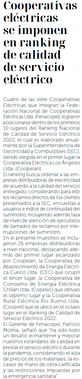 Cooperativas Eléctricas destacan en Ranking de Calidad de Servicio Eléctrico 2022 - (revistaei.cl)