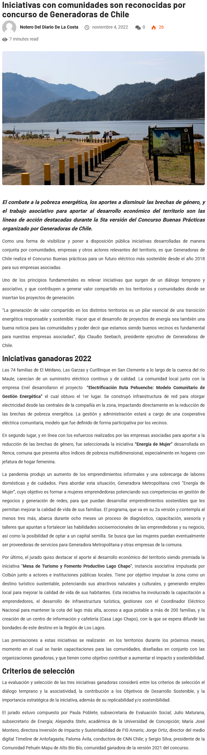 Iniciativas con comunidades son reconocidas por concurso de Generadoras de Chile - (diariosustentable.com)