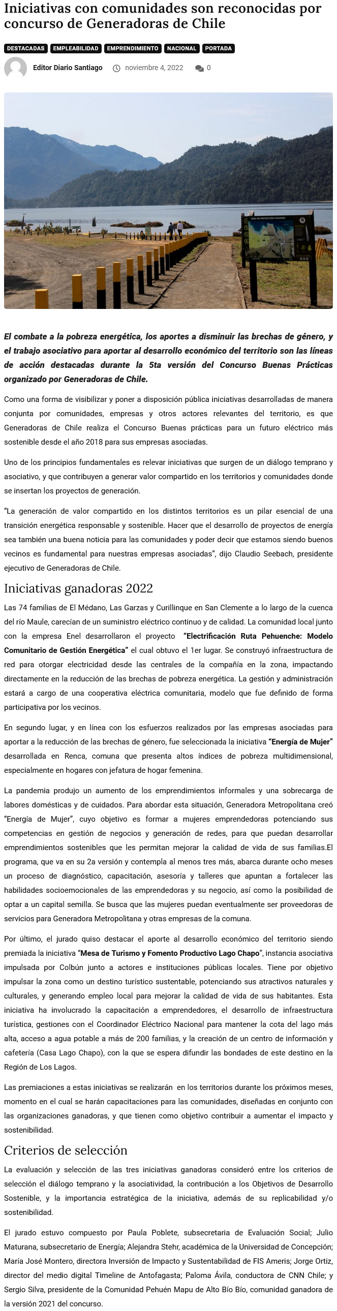 Iniciativas con comunidades son reconocidas por concurso de Generadoras de Chile - (diariosustentable.com)